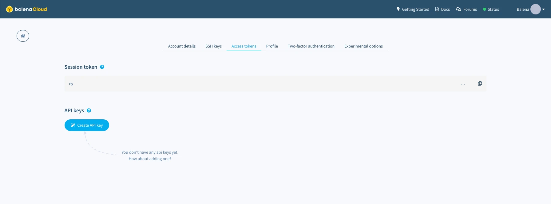 Access tokens are used for authentication in the balena API, CLI, and Node.js and Python SDKs. They are managed in the Access tokens tab of the Preferences page, which can be found via the dropdown menu in the upper-right corner of the dashboard: